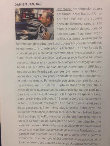 Dans le numéro 428 de janvier - mars 2017, sono mag s'interesse au freespeak 2 de clear-com