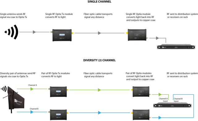 Plus de contraintes de longueur de coaxial, possibilité de déporter les antennes à plusieurs centaines de mètres, couverture hf en multi sites ou multi halls grâce au 4-zone combiner .