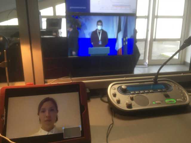 Nos interprètes en plein travail bien installés dans leurs cabines (distanciées bien sûr ) .