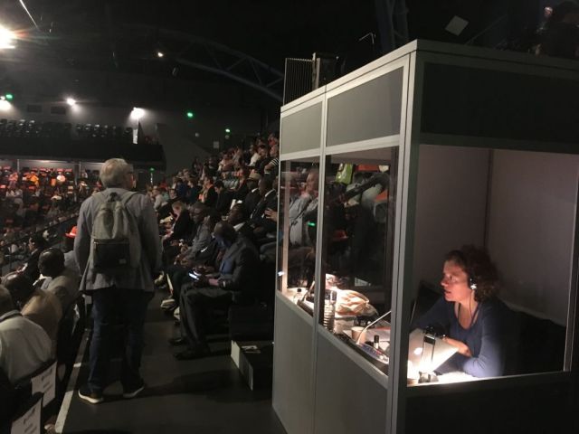Nos interprètes en plein travail bien installés dans leurs cabines (distanciées bien sûr ) .